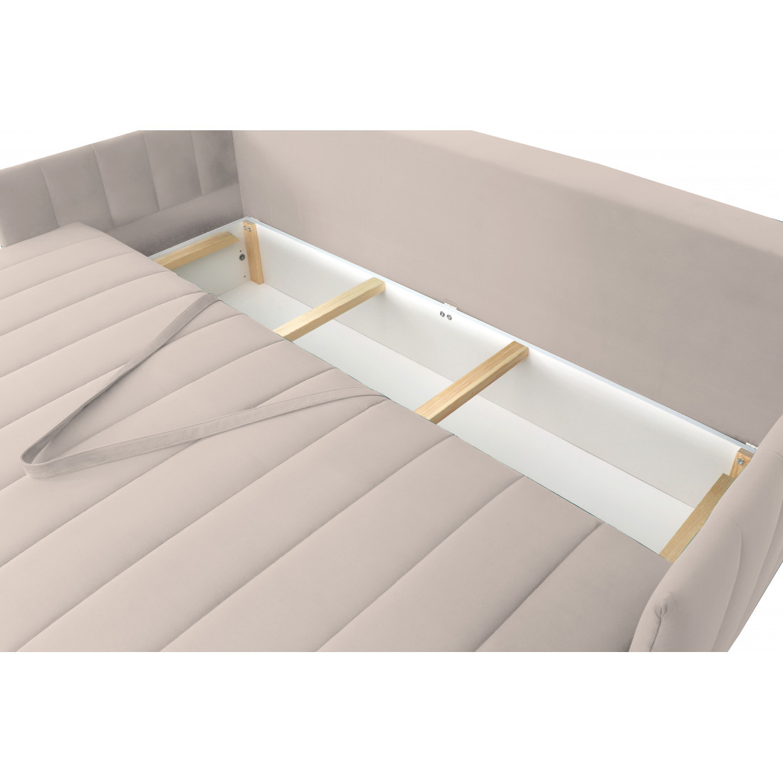Диван удачно зонирует пространство и дополняет необходимым функционалом. В основании спального места блок независимых пружин для комфортного сна. Вместительный ящик для хранения постельных принадлежностей.