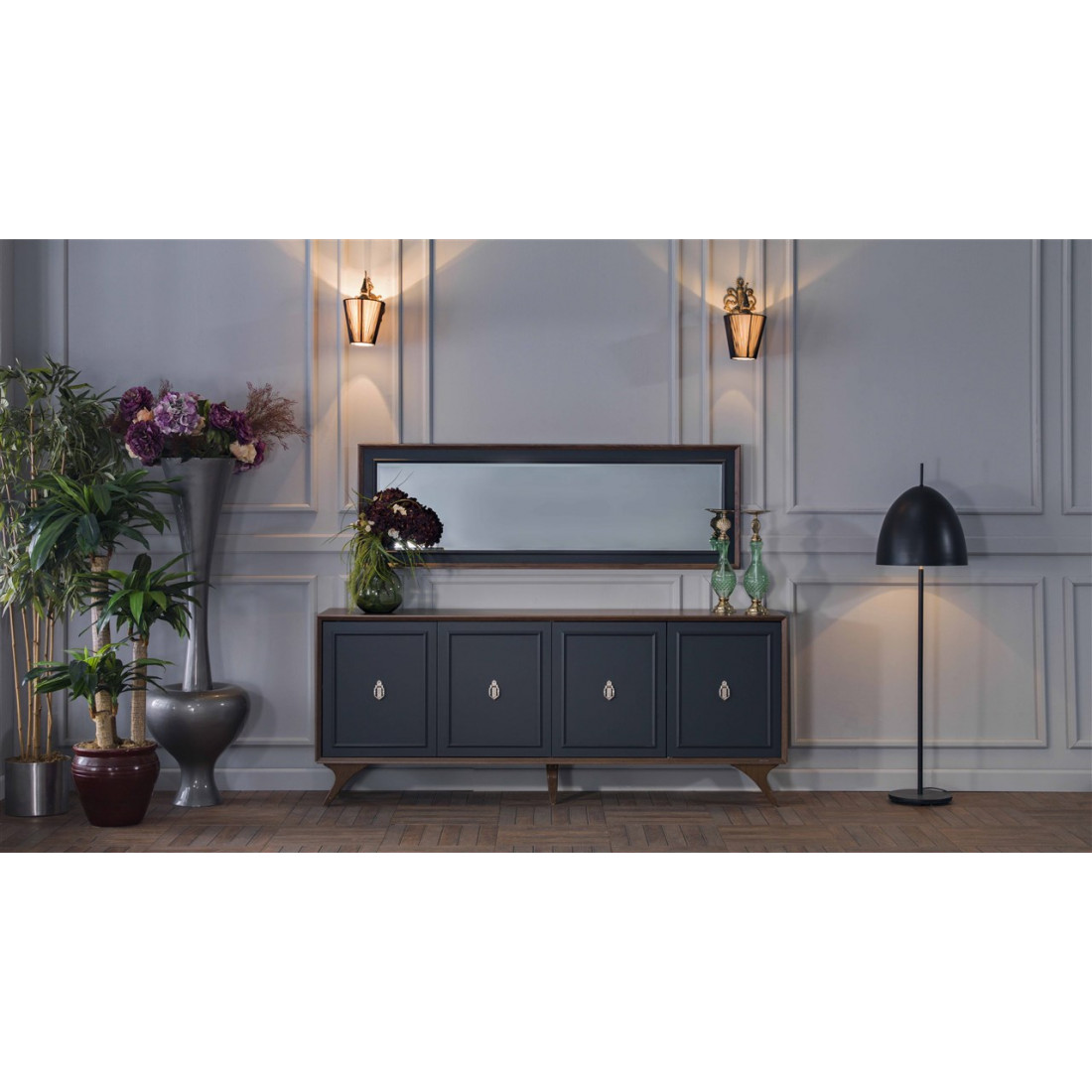 Длинный комод для посуды в гостиную ALEG-10 серии Алегро от Беллона средней высоты (840) станет прекрасным, многофункциональным дополнением интерьера гостиной и столовой. Ажурные ручки образуют единый декоративный элемент, сходясь в центре фасадов. В качестве материала для фасадов, столешницы и ножек использовался МДФ.