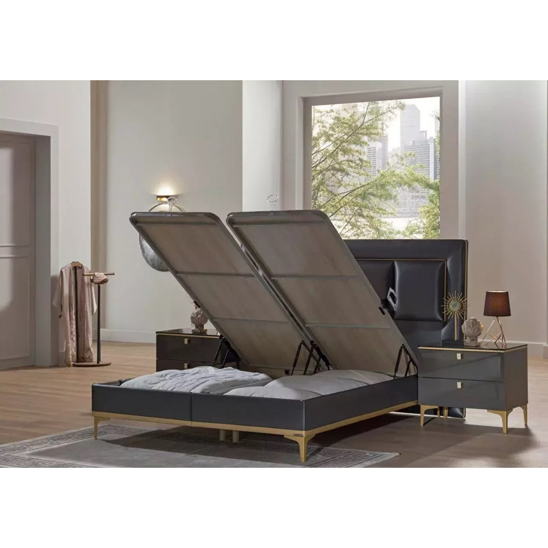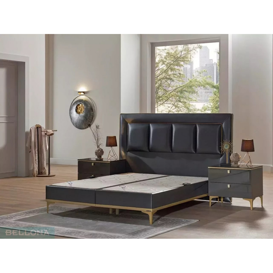 Кровать (база) без спинки CARLINO, щитовой конструкции на декоративных ножках c подъемным жестким основанием под матрас. Щитовой каркас кровати плита ЛДСП т.18мм, дно плита МДФ 6мм. Каркас обит поролоном, винилискожей двух цветов, основного цвета и в нижней части обивка винилискожа контрастного золотого цвета. Жесткое основание кровати рамочной металлической конструкции на основе трубы профильной размером 20х30,20х20 с подъемным механизмом. Настил основания поролон т.3мм, основание обито тканью. Сборка каркаса базы на шкант, скобу металлическую, уголок пластмассовый. Подъемный механизм устанавливается при помощи винтов и винтов с гайками. Ножки кровати пластмассовые, четыре ножки декоративные, шесть опорных круглых ножек, ввинчивающихся для двойных баз. На дно базы устанавливается аэратор пластмассовый с логотипом Bellona для кондиционирования воздуха. Ручка -держатель для подъемного основания металлическая.