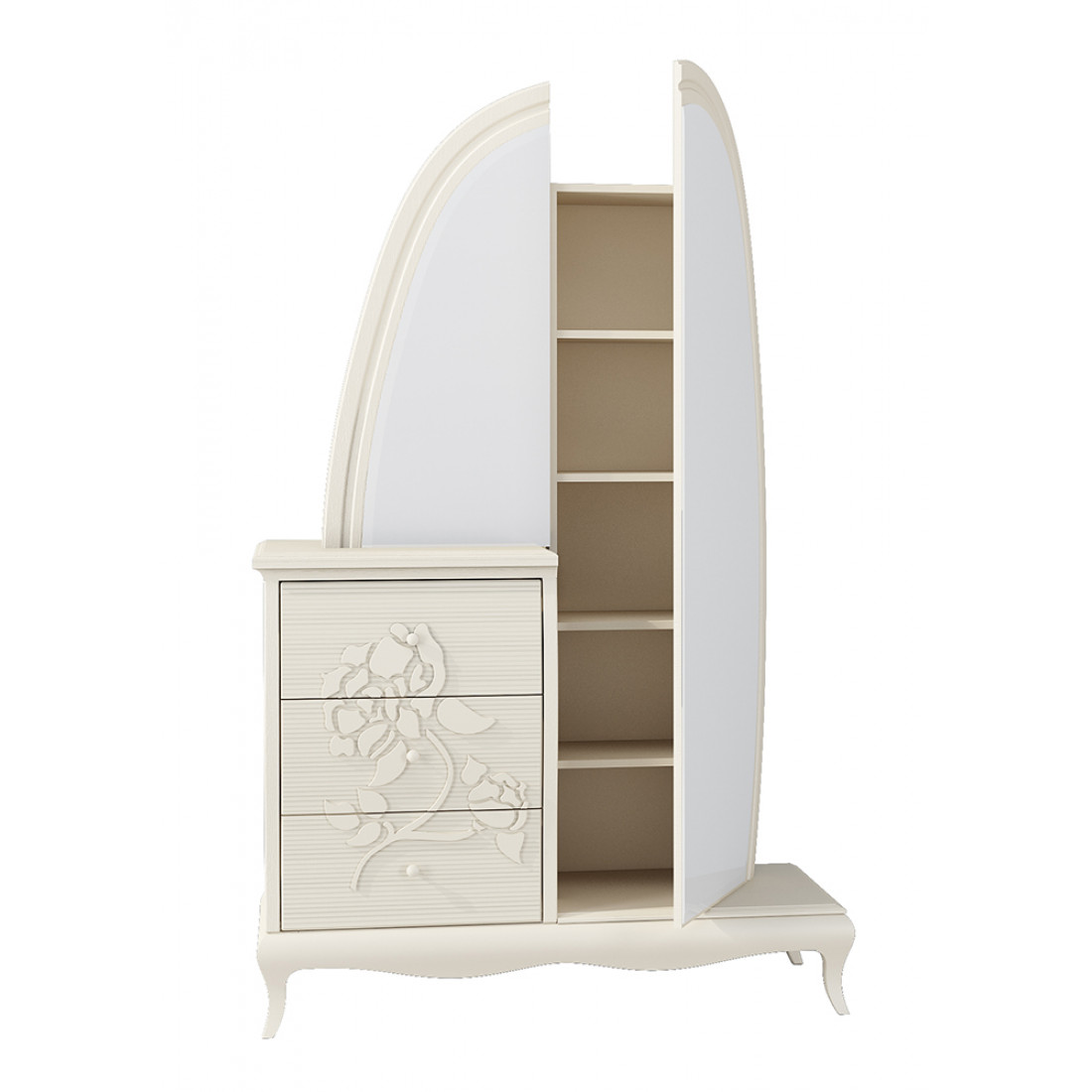 Комбинированный шкаф для одежды и белья с зеркалом МН-218-10 серии Астория от фабрики Мебель-Неман представляет собой разновидность оригинального трюмо и небольших размеров комода, состоящего из зеркала в полный рост в форме эллипса и вместительной тумбы. Купить утонченный и эффектный комплект для спальни стоит в любую просторную комнату – он придаст ощущения будуарности и великолепия в интерьер.