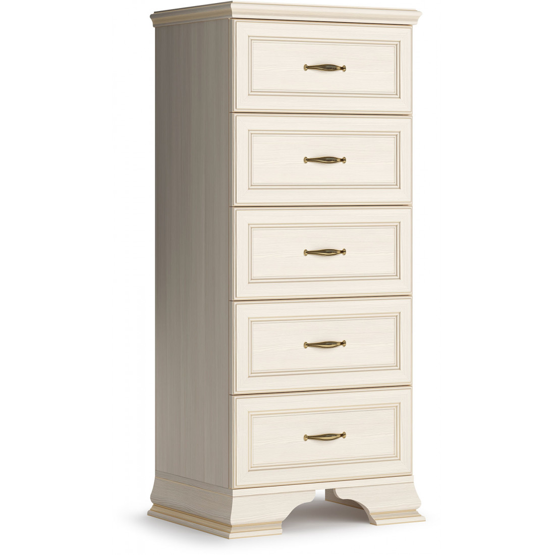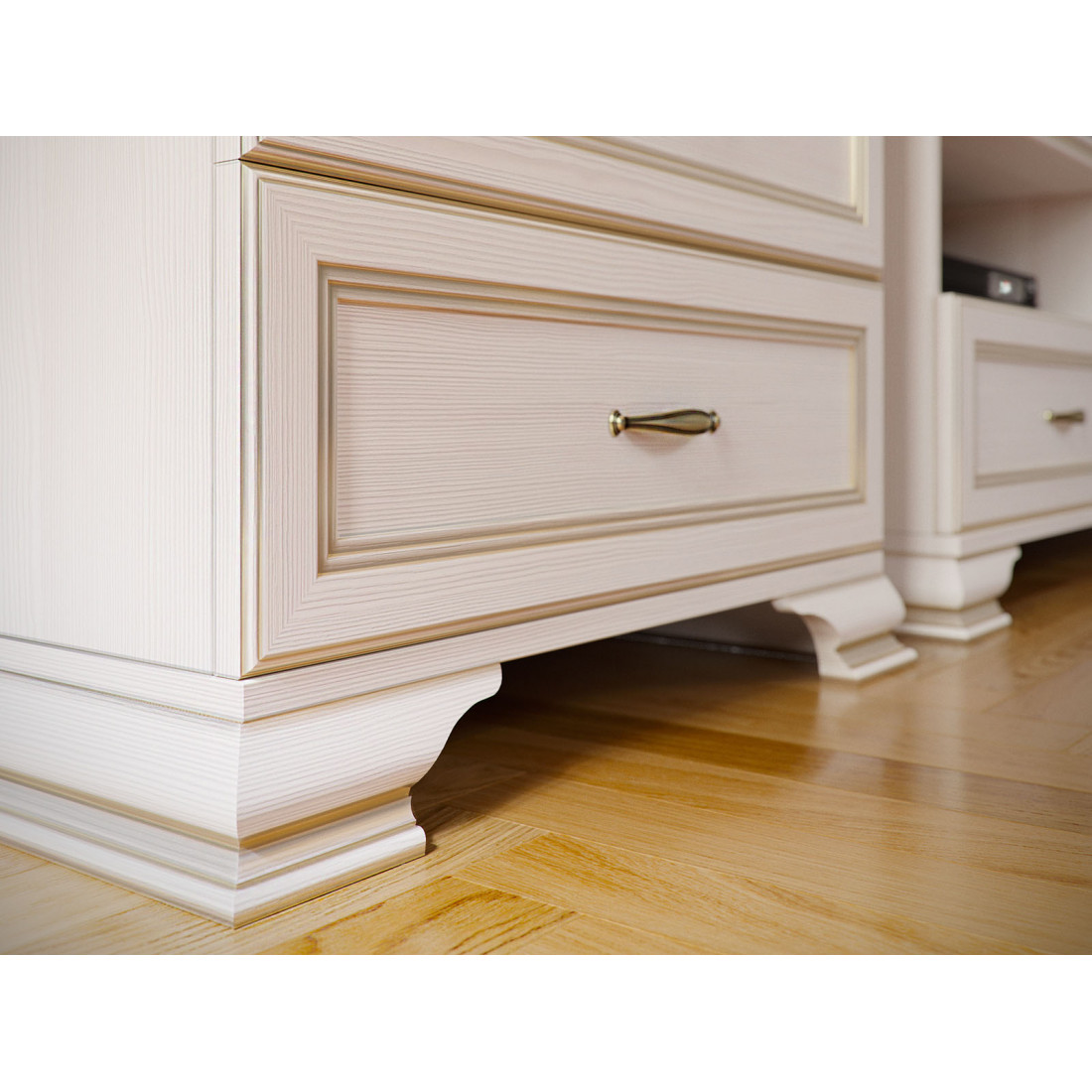 Коллекция производится в текстуре «бодега белый» с эффектом золотого патинирования. Облик «Сиены» дополняют рамочные фасады и карниз в классическом стиле, а также эффектные опоры из МДФ. Мебель комплектуются металлической лицевой фурнитурой премиум-класса в цвете «старая бронза» и надежной крепежной фурнитурой.