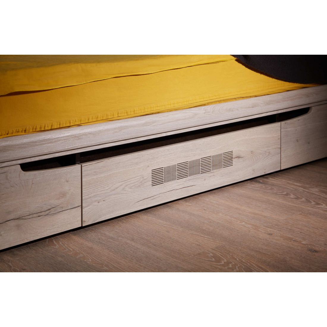 Кровать односпальная с ящиками Мале - обладательница лаконичного и свежего дизайна. Она является представителем коллекции «Мале». В этой коллекции особое внимание уделено внешнему виду и тактильным ощущениям от прикосновения к мебели, схожей с натуральным деревом по рисунку и шероховатости.