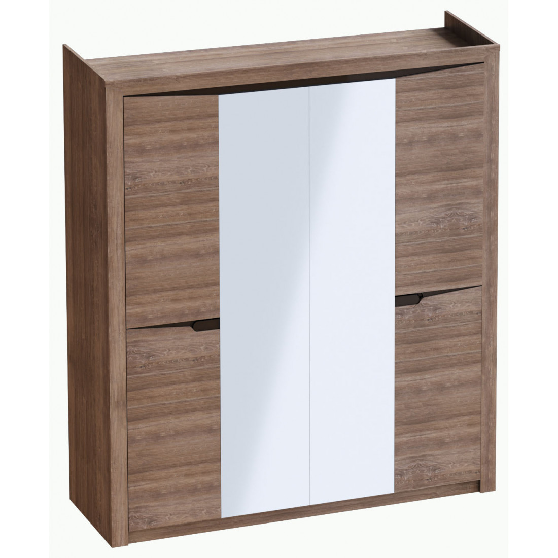 Четырехдверный шкаф для одежды из коллекции Соренто Дуб стирлинг порадует ценителей лаконичных форм своими простыми, современными линиями и приятной светлой деревянной текстурой, создающей чувство покоя и комфорта в вашем доме. Встроенное зеркало - утилитарное решение для удобного подбора гардероба, к тому же, оно визуально расширит пространство.