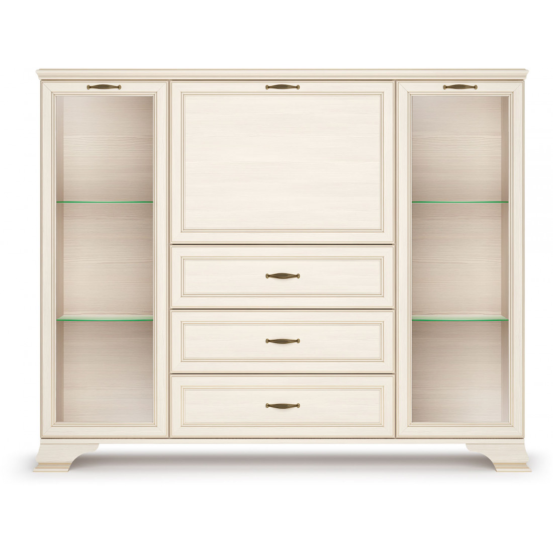 Коллекция производится в текстуре «бодега белый» с эффектом золотого патинирования. Облик «Сиены» дополняют рамочные фасады и карниз в классическом стиле, а также эффектные опоры из МДФ. Мебель комплектуются металлической лицевой фурнитурой премиум-класса в цвете «старая бронза» и надежной крепежной фурнитурой.