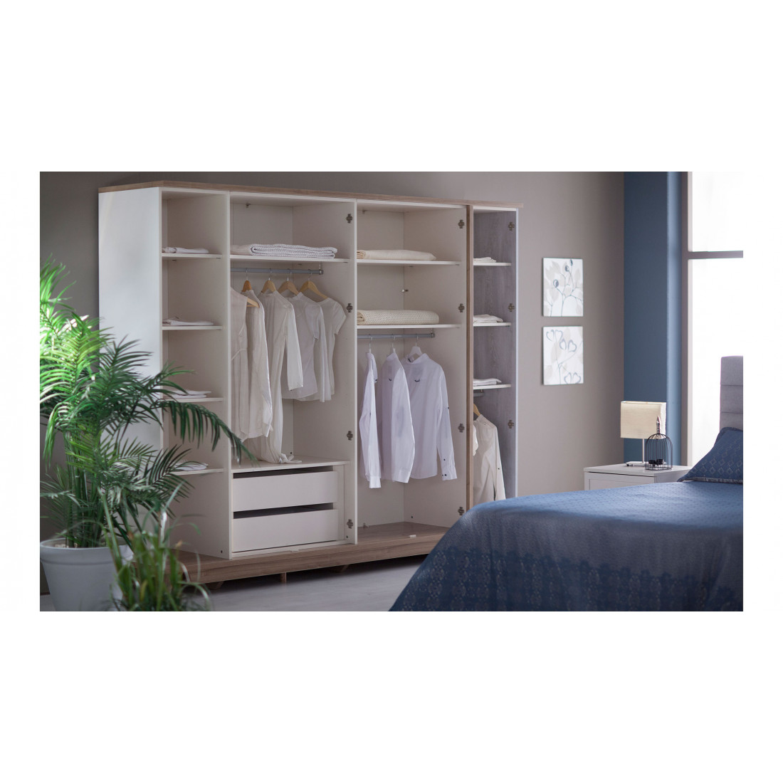 Шестидверный платяной шкаф Mavenna изготовлен из высококачественного ЛДСП производства Турция, класс эмиссии формальдегидов Е1. Две зеркальных двери по центру скрывают широкое отделение, справа узкая дверь -с имитацией досок серого цвета, слева 2 узких отделения за 2 бежевыми дверями. Шкаф вместительный, по высоте подходит для большинства помещений, глубина 62 см - позволит удобно разместить вешалки. Двери и ящики с доводчиками, обеспечивающими плавный ход и безопасность.