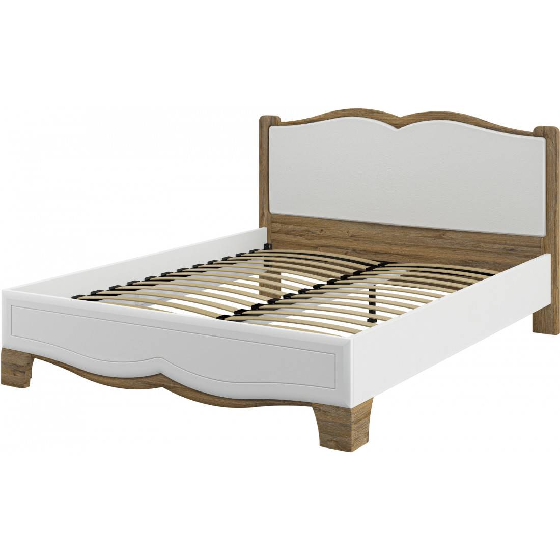 - Мягкое изголовье кровати изготовлено из экокожи белого цвета.