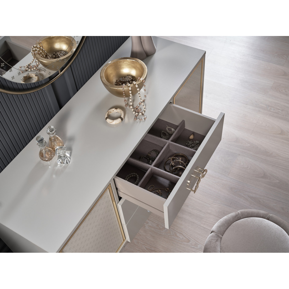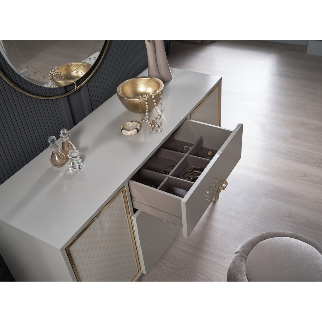 В туалетном столике Валеско используется стеклянный узор в стиле АРТ-ДЕКО и система открывания push-to-open
