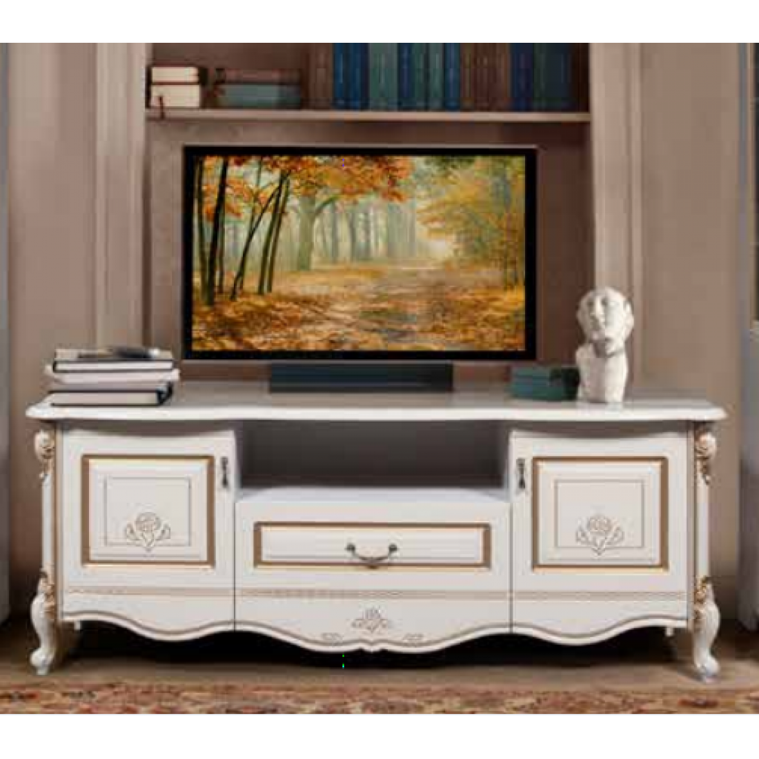 Тумба под телевизор Аллегро (беж) - это тот самый модуль без которого ваша гостиная не сможет справиться. Она имеет вместительные полки которые смогут вместить все необходимые вещи. Ее бежевый цвет в сочетании с золотым орнаментом на фасаде служит показателем богатства и престижа хозяев дома.