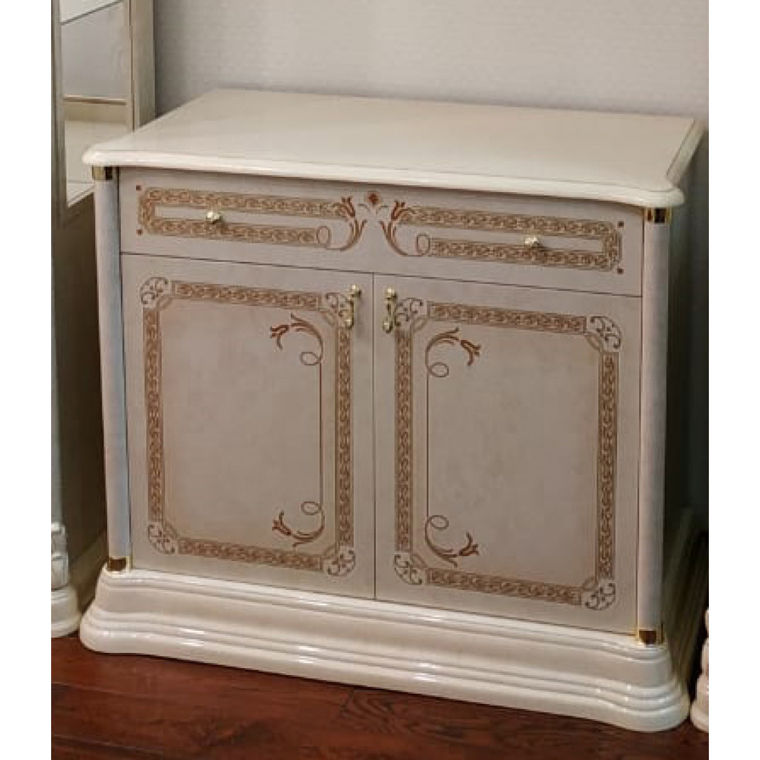 Тумба Роза (беж) от фабрики ДИА мебель выполнена в классическом стиле. Бежевый цвет в сочетании с глянцевым покрытием и золотистым орнаментом на фасаде придает этой модели изящность и элегантность. Удивит вас своей вместимостью и компактностью. Послужит идеальным дополнением к другим модулям вашей гостиной.